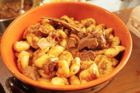 Meso narežite na srednje velike komade pa ga lagano popržite na svinjskoj masti i stavite sa strane. Na istoj masnoći pirjajte narezano povrće i gljive dok povrće ne omekša, vratite meso, posolite i popaprite, dodajte vino pa kuhajte na laganoj vatri barem nekoliko sati. U međuvremenu napravite njoke od krumpira ili pak - još bolje - domaće istarske fuže.