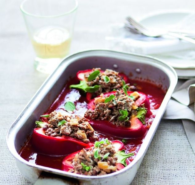 Žemlje narežite na kockice, stavite u posudu, prelijte mlijekom i ostavite da malo odstoji kako bi se dobro upilo. Luk i češnjak ogulite i nasitno narežite. Polovicu količie luka popržite u tavi na žlici zagrijanog ulja. Nakon 2 minute dodajte polovicu količine češnjaka, a nakon još minute meso i pecite ga dok ne posmeđi. Potom sve izmiješajte s namočenim pecivom. Ovako pripremljenu smjesu izmiješajte s listićima origana te posolite i popaprite. Paprike operite, osušite, uzdužno ih prepolovite i izvadite sjemenke. Polovice paprika napunite smjesom od mesa i posložite u posudu za pečenje namazanu masnoćom. U loncu zagrijte preostalo ulje pa popržite ostatak luka i češnjaka. Nakon pet minuta dodajte rajčice, lovorov list, crni papar i piment, posolite i pustite da provrije. Vrući umak nalijte u posudu za pečenje s paprikama, stavite u pećnicu zagrijanu na 180 stupnjeva i pecite 20-ak minuta. Poslužite uz tjesteninu, rižu ili pecivo.