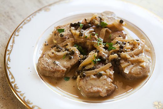 S medaljona uklonite kožicu, operite ih i eventualno narežite na kriške debele oko 1,5 cm, a zatim začinite solju i paprom. Stavite ih u zdjelu i pokapajte maslinovim uljem. Ostavite ih sat vremena na hladnome. Luk kozjak ogulite i narežite na kockice. Bosiljak operite, otresite vodu i nasitno nasjeckajte. Marinirano meso zapecite s obje strane u tavi s debelim dnom oko 5 minuta, zatim ga stavite na stranu, a u tavi rastopite polovicu pripremljenog maslaca. Luk kozjak propirjajte na maslacu, zalijte vinom pa pirjajte dalje na jakoj vatri kako bi tekućina ishlapila. Maknite tavu sa štednjaka pa u umak umiješajte preostali maslac i bosiljak. Umakom prelijte meso i odmah poslužite.