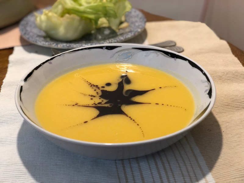 Na maslinovom ulju najprije kratko propirjamo luk, dodamo zatim na kockice isiječenu bundevu i sve zajedno još malo pro pirjamo. Dodamo zatim krumpir također izrezan na kockice , zalijemo vodom, poslolimo i popaprimo te kuhamo na laganoj vatri dok se krumpir ne skuha. Skinemo s vatre i usitnimo štapnim mikserom, ukoliko je pregusta juha dodamo još vode i lagano prokuhamo. Poslužimo.