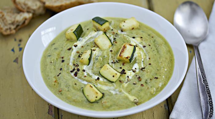 Preostale tikvice ispecite na gril tavi. Razmutite kiselo vrhnje, umiješajte u juhu prije posluživanja, dodajte grilane tikvice, začinite svježe mljevenim paprom i poslužite.