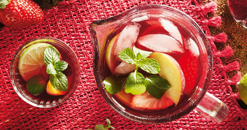 Marelicu, jagodu i breskvu oprati i isjeckati na sitne komade i iscijediti naranču. Drugu naranču i limetu oprati u vrućoj vodi i isjeći na tanke ploške. Pomiješati crno vino, vinjak i sok od naranče te im dodati šećer i komadiće voća. Staviti hladiti barem sat vremena. Uliti sangriju u čaše sa ledom i listićima metvice. Po želji dodati hladnu mineralnu vodu i čaše ukrasiti ukrasima za koktele.