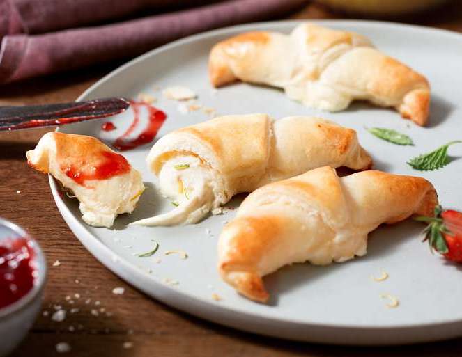 Razvaljaj lisnato tijesto i izreži ga na šest kvadrata. Kvadrate tijesta položi dijagonalno, dodaj kremu od sira i oblikuj kroasane.