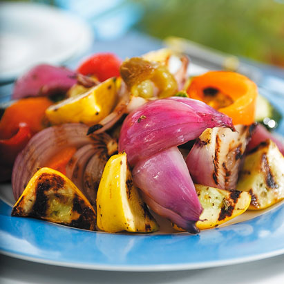 Luk i paprike očistite te ih narežite na komade željene veličine. Stavite sve u zdjelu, dodajte češnjak koji ste prethodno narezali na kriške. Sve začinite s dvije žlice maslinova ulja i dobro promiješajte. Začinjeno povrće pecite na roštilju ili grill tavi oko 5-6 minuta s obje strane.