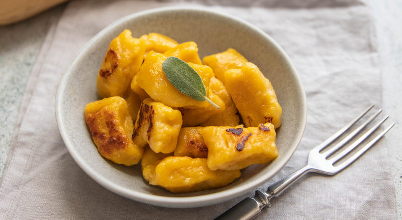Pireu od tikve dodajte 2 šalice krumpira kojeg ste kuhali u kori 25 minuta, a potom ogulili i usitnili uz pomoć gnječilice za krumpir. U posudu dodajte i ribani sir, jaje, obilan prstohvat soli te sve dobro promiješajte. Smjesi potom dodajte 2 i pol šalice brašna i promiješajte tek da se brašno upije. Nemojte predugo mijesiti tako da njoki ne budu tvrdi. Preostalu polovicu šalice brašna pospite po radnoj površini i prebacite komade tijesta. Oblikujte u duge valjke i oštrim nožem režite pojedinačne njoke.